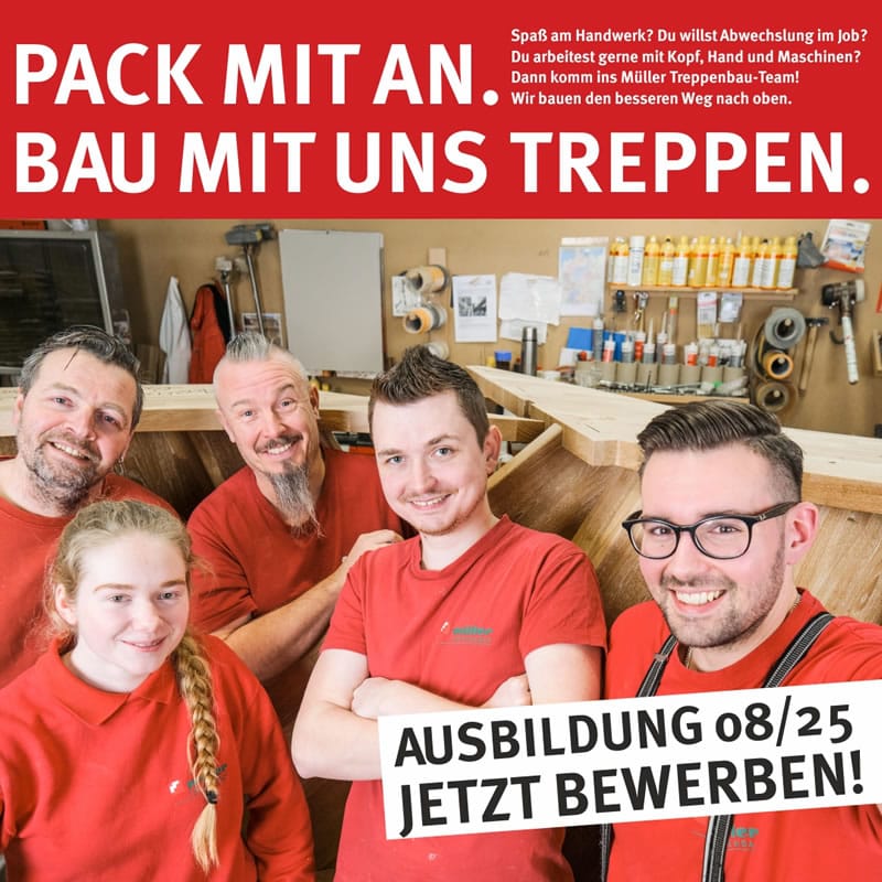 Gestalten Sie mit uns Ihre Treppe ganz nach Ihren Wünschen! Ob traditionell, modern oder individuell nach Maß – bei Müller Treppenbau finden Sie die passende Lösung. Lassen Sie sich persönlich beraten und erleben Sie die Qualität und Erfahrung unseres Familienbetriebs mit mehr als 150-jähriger Tradition. Kontaktieren Sie uns und machen Sie den ersten Schritt zu Ihrer individuellen Treppenlösung!